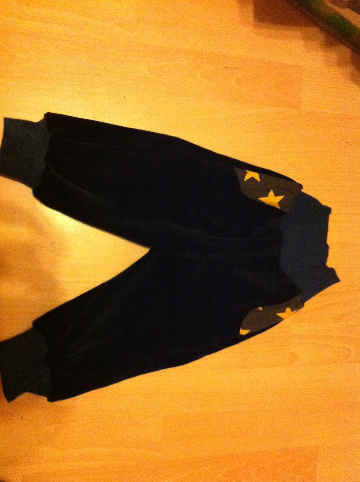 Sitten nämä housut. Sain Pehemiältä joustofroteeta testaukseen. Kangas on mukavan tuntuista. Mietin ja pohdin mitä tastä tekisin, eka mietin huputonta jumpsuitia vauvalle vaan ei riittänyt. Sitten sattui löytymään housun kaavat valmiina niin tein sellaiset =)